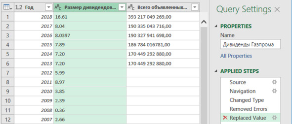 Все выполненные шаги по преобразованию данных выводятся в списке
