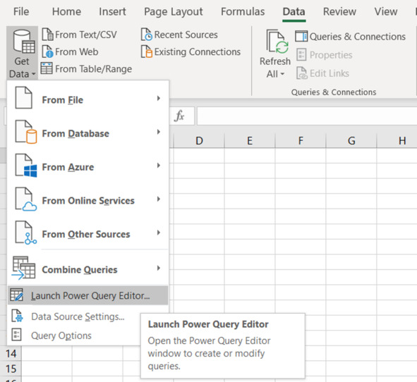 Data – Get & Transform – Get Data – Launch Power Query Editor.