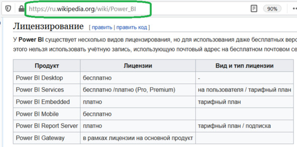 Перейдём на сайт Википедии в браузере и найдём статью «Power BI» (рис. 2.1). В тексте статьи есть таблица с описанием лицензий. Попробуем загрузить эту таблицу в Excel. Скопируем адрес выбранной страницы в буфер обмена.
