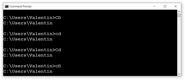 Регистр букв. Команды можно вводить и заглавными (большими) и строчными (маленькими) буквами – командной строке Windows это будет понятно: CD, cd, Cd, cD, см. рис.