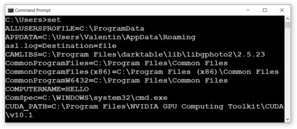 Команда set (англ. Set – «установите значение, задайте состояние, настройте») позволяет просматривать и изменять переменные (параметры) среды окружения (англ. Environment variables – «переменные окружения»). Имеется в виду среда выполнения программ.