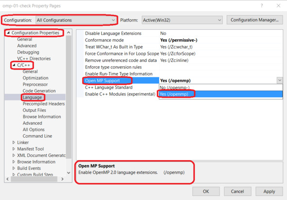 Configuration Properties – C/C++ Language – OpenMP Support – Yes.