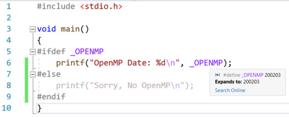 В окне редактирования программы сразу видно, что у нас включена поддержка OpenMP (рис. 3.9). Наводим курсор на идентификатор _OPENMP и видим, что он был определён.