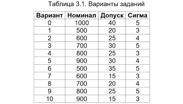 В таблице 3.1 представлены варианты заданий. Нулевой вариант используется для демонстрации методики работы. Студенты используют варианты с 1 по 10. Номер варианта соответствует последней цифре номера зачётной книжки. Если номер зачётки заканчивается на 0, используйте вариант 10.