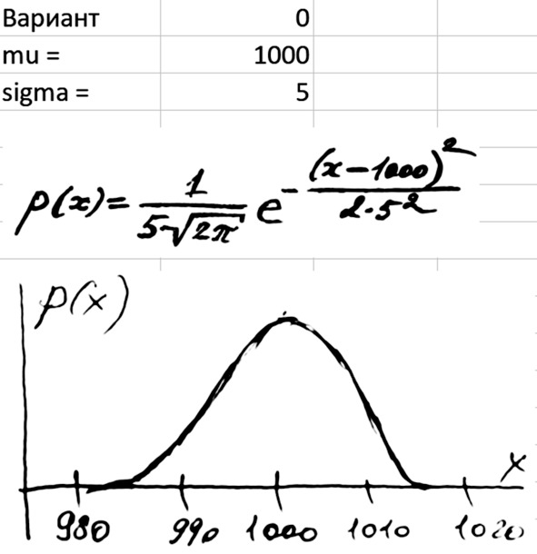 Построим график нормального распределения для своего варианта по формуле (4.1). Для этого создадим столбец в несколько десятков чисел в пределах «среднее плюс-минус три сигмы». Для нулевого варианта возьмём числа от 980 до 1020 с шагом 1. Вставим график на той же странице отчёта, где находится зарисовка для нашего варианта (рис. 4.3). Используем «точечный график», в котором задают массив «иксов» и массив «игреков»: