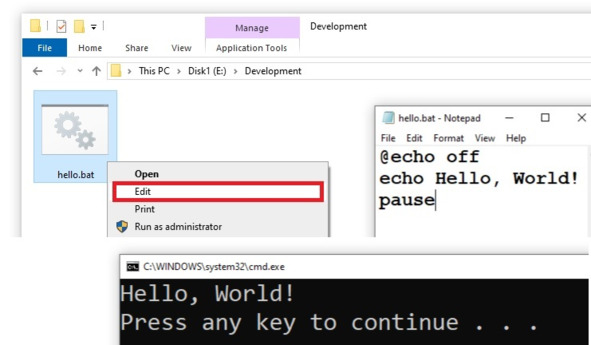 Открываем Блокнот и составляем простую программу, см. рис. Сохраним ее в файле hello.bat. Все наши программы будем складывать в одну «рабочую» папку. В нашем примере это каталог Development на диске E. Кстати, слова «папка», «каталог», «директория», «folder» – это разные названия одного и того же объекта. Просто их используют в разных ОС и в разное время. Наверное, скоро ещё что-нибудь придумают.