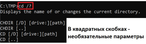 Эти дополнительные параметры описаны в справке по выбранной команде. Чтобы получить описание команды CD, напишем CD /? и нажимаем Enter. В таком описании действует общее соглашение: в квадратных скобках приводятся необязательные параметры. Их можно не указывать. Но если мы захотим их использовать, то квадратные скобки не нужны, см. рис.