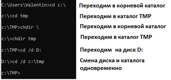 На входе любой команды мы сообщаем дополнительные параметры – через пробел. Это параметры (аргументы) командной строки. Например, мы можем написать команду CD без параметров и получить имя текущего каталога. Можем перейти в корневой каталог текущего диска: CD \. Либо мы напишем CD TMP и перейдем в каталог под названием TMP. Каждый раз текущий каталог выводится в начале командной строки в виде приглашения к вводу команд. Дополнительные параметры мы указываем через пробел после имени команды.