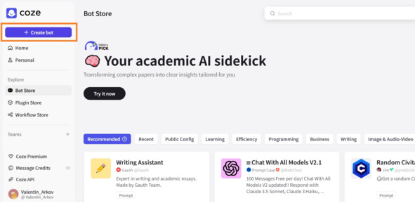 Переходим к инструменту под названием COZE, самому необычному на сегодняшний день. Здесь потребуется зарегистрироваться. Бесплатно. Например, с учетной записью Google. Нажимаем кнопку Get started справа сверху – то есть начать работу. Здесь мы сможем создать своего собственного бота, с которым будем дальше общаться.