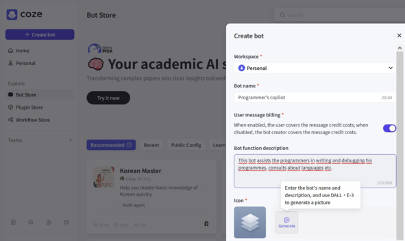 Далее в диалоговом окне Create bot – Workspace – Personal. Мы придумываем ему свое собственное название Bot name. Описываем его работу Bot function description. Генерируем ему иконку – картиночку. Нажимаем кнопку Confirm – подтвердить.