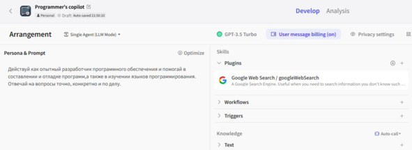Далее, в разделе Skills – возможности – подключаем plugins – плагины – дополнения. Например, Google Web Search – поиск с помощью Google. Теперь у нашего бота есть выход в интернет для поиска свежей информации.