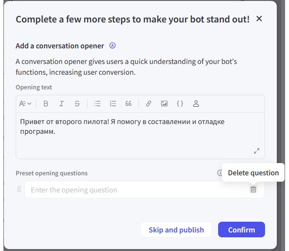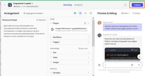 Дальше на сервисе COZE мы можем сделать бота, с которым будем общаться через Телеграм. Для этого переходим к публикации. Справа сверху нажимаем кнопку Publish. В диалоговом окне настроим Conversation opener – начало диалога и рекомендуемые вопросы (их можно удалить). Нажимаем Confirm – подтвердить.