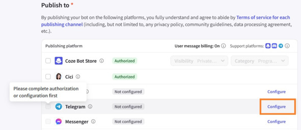 В диалоге Publish to указываем платформу для публикации бота снимаем галочку Coze Bot Store – официальный магазин ботов. Видим, что в разделе Telegram у нас галочка не активна. Зато справа есть кнопочка Configure – настроить.