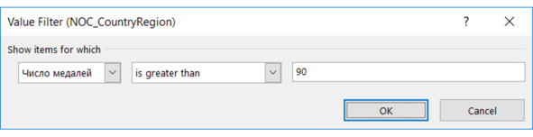 Какие же страны были отобраны после фильтрации? Можно видеть, что фильтр «Больше 90» затрагивает общее, СУММАРНОЕ КОЛИЧЕСТВО медалей по выбранным видам спорта. Другими словами, мы выбрали страны, получившие боле 90 медалей по пяти видам спорта – в сумме.