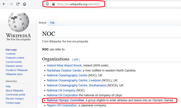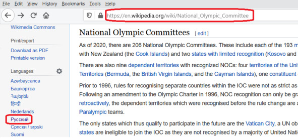 Задание. Откройте в английской версии Википедии статью «National Olympic Committee». Переключитесь на соответствующую русскую страницу.