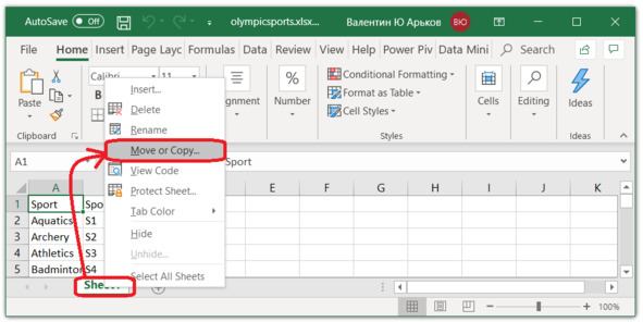 Скопируем лист с таблицей по видам спорта и вставим его в наш файл отчёта.