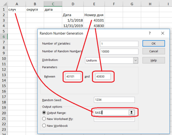 Вначале генерируем случайные даты. Мы выбрали номера дней начала и конца интервала по времени. Вызываем генератор:
