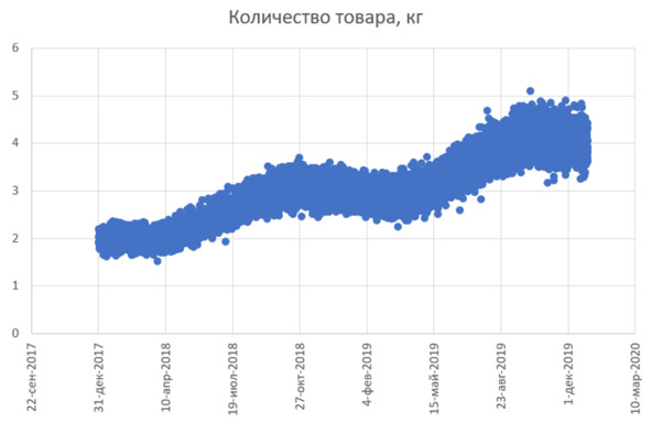 Проверим, что получилось в результате моделирования. Построим диаграмму разброса «Дата – Количество» (рис. 5.3). Тренд – общая тенденция от 2 до 4. Сезонность присутствует. Случайный разброс увеличивается вместе с ростом среднего значения. Пока грубых ошибок не обнаружено. Вычисляем стоимость в рублях.