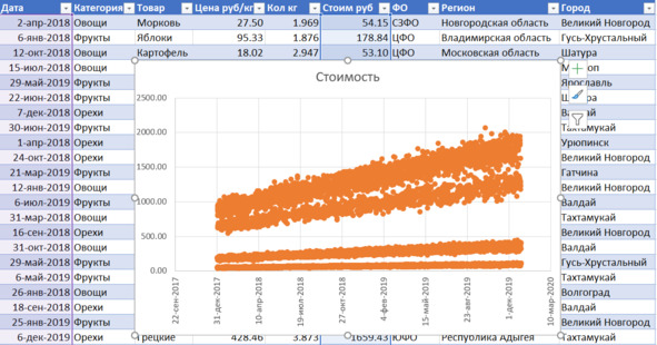 Построим диаграмму разброса «Дата-Стоимость» (рис. 5.4). Убедимся, что грубых ошибок нет.
