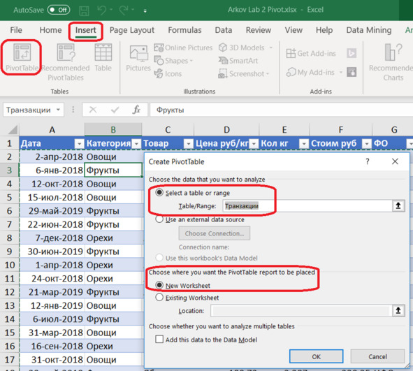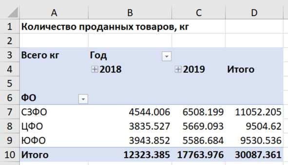 Для начала построим простую сводную таблицу. В предыдущей работе мы подробно рассмотрели, как это делается.