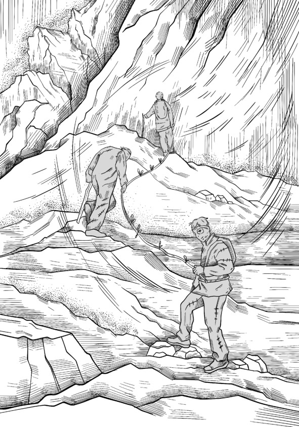 На малой крутизне я ещё мог прорубать ступеньки, сметавшие и снег и камень, но на крутых подъёмах опасность разбиться даже со ступеньками была слишком велика, а траверсирование приводило к потере времени для ориентации. Мы как будто ходили кругами в сложных складках каменных склонов. Пару раз я переносил своих друзей наверх колдовством, если там виднелись хорошие площадки, но это оказалось опасным занятием, потому что места приземления снизу не были видны и их наклон грозил соскальзыванием.