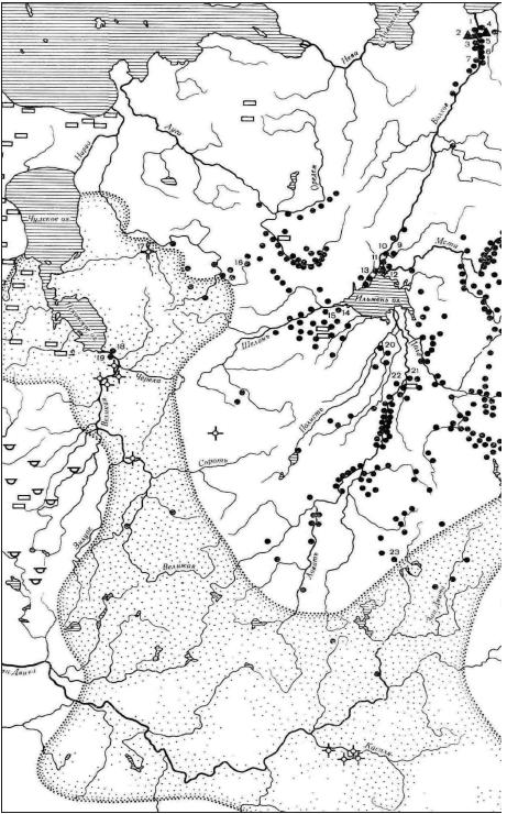 Ключевое значение скрещения важнейших торговых путей у истока Волхова наглядно демонстрируется высокой концентрацией населенных пунктов конца I тысячелетия на этой территории[10] (рис. 3 – по Носову).
