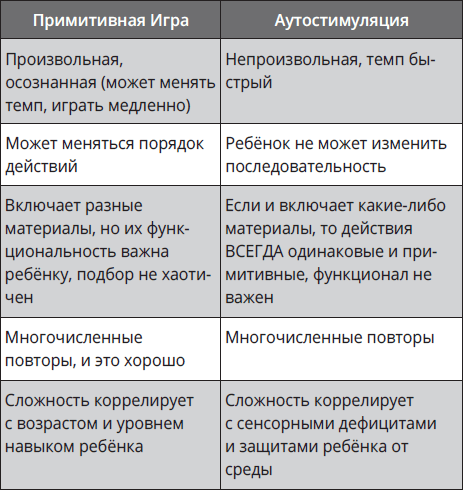 Также отметим, что ребёнок может бегать туда-сюда, прыгать по дивану или кровати, трясти кистями, постоянно раскачиваться, и это поведение мы отнесём к ДОИГРОВОМУ ЭТАПУ. Игра – это деятельность с использованием материалов окружающего мира (в дальнейшем это могут быть абстракции, фантазийные элементы) и их изучение. Если ребёнок демонстрирует одно и то же навязчивое поведение с собственным телом – это самостимуляция (шевелить пальцами перед глазами, раскачиваться, кружиться и т. д.). В целом самостимуляция свойственна ВСЕМ живым организмам, и это нормальное явление. Однако если вы теребите волосы, грызете шариковую ручку, дрыгаете ногой, а вас позовут – вы прекратите и «включитесь» в социум. Проблема самостимулятивного поведения в том, что оно может быть настолько нужным и простым, что ребёнок не способен так легко выйти из него. И при любой свободной секундочке не играет, не скучает, не учится, не общается, а демонстрирует самостимуляцию. Самостимуляции возникают как защита от новых стимулов окружающего мира, они блокируют всё «опасное» для ребёнка, характеризуются моторными стереотипами, проявляются повышенным возбуждением и предпочтением ребёнка этой деятельности.