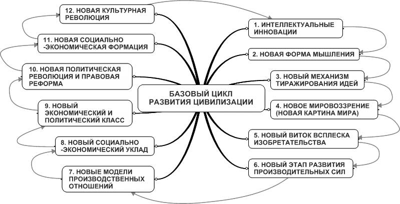 Как видим, механизмом запуска цивилизационного цикла является накопление интеллектуальных инноваций, приводящее к появлению качественно нового Метода создания новых знаний, который мы назвали формой мышления.
