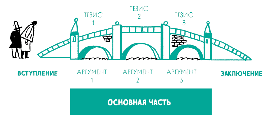 Так выглядит классическая схема сочинения, которая кажется мне более устойчивой. Но встречается и упрощенный вариант, где тезис один, он сразу помещается во вступление, а основная часть состоит только из аргументов: