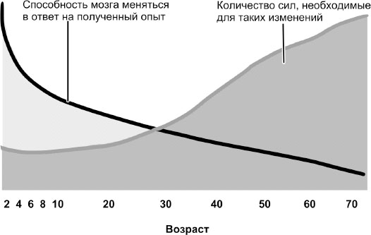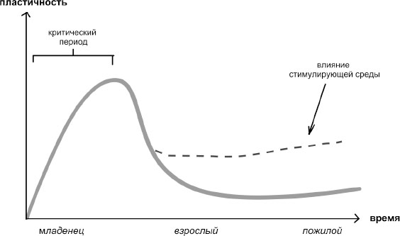 (Заметьте, кривая нейропластичности не уходит в пике и не врезается в ось абсцисс, она плавно снижается, но не исчезает. Мозг может изменяться на протяжении всей жизни, просто делает он это чуть менее охотно.)