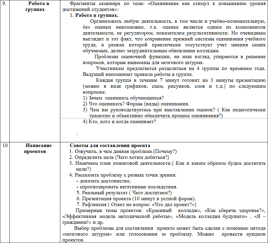 1. Проведение занятий (тренингов, деловых, ролевых игр и др.) с преподавателями по основным проблемам, выявленным в ходе диагностики. Структура каждого занятия состоит из трёх основных частей: теоретическая (мини-лекции); практическая, включающая отработку навыков интерактивного обучения; рефлексивная часть, включающая индивидуальную и групповую рефлексию.