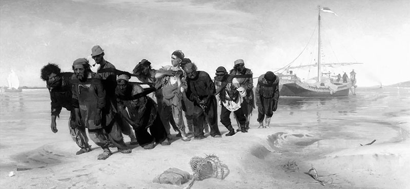 Но жить на что-то нужно, и я снова каждое утро впрягаюсь в эту лямку, как бурлак на Волге, и тащу её дальше. Смотри рисунок: картина Репина «Бурлаки на Волге».