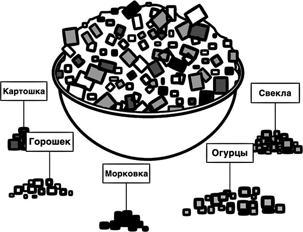 Наша задача – разобрать этот винегрет на отдельные кучки: кубики свёклы в одну кучку, морковки – в другую, картошку – в третью кучку и так далее.