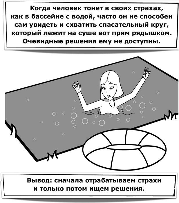 Резюме1. Когда человек тонет в своих страхах, как в бассейне с водой, часто он не способен сам увидеть и схватить спасательный круг, который лежит на суше вот прям рядышком.