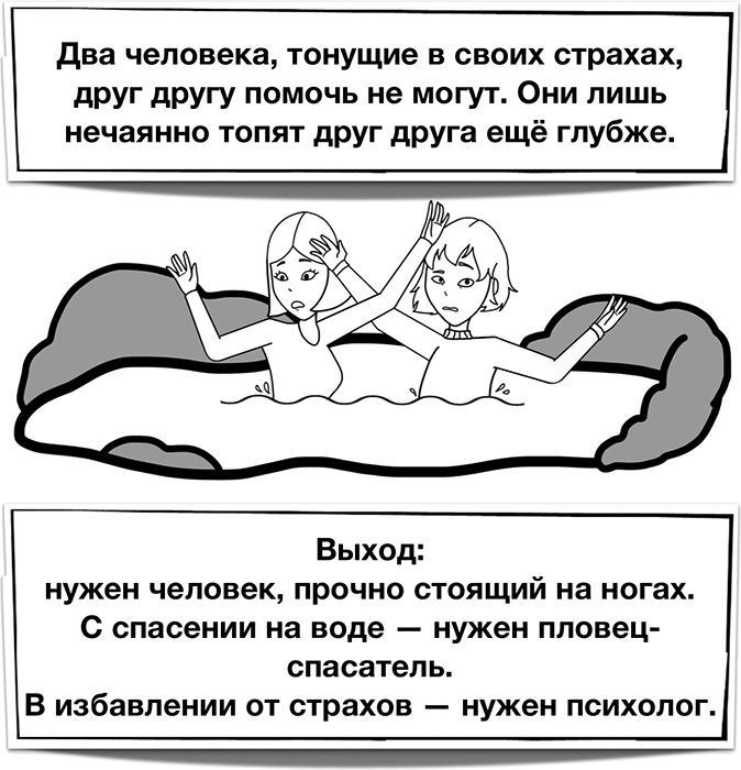 2. Помогать близкому человеку отработать какой-то конкретный страх можно и нужно. При этом, конечно же, делать это важно только после того, как вы сами уже стоите на ногах спокойствия, а не барахтаетесь в собственных страхах. Иначе это как два тонущих человека будут просто рядом друг с другом махать руками и нечаянно топить другого еще глубже.