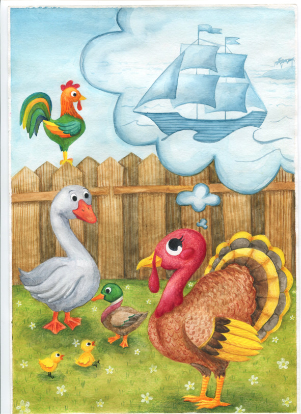 Давным-давно на большом красивом корабле с белым парусом возвращался из своего путешествия испанский мореплаватель Христофор Колумб. В далеком странствии он обнаружил новую землю, которую потом назвали Америкой. Много нового и удивительного увидел Христофор на новой земле и, возвращаясь домой, решил это новое показать у себя на родине. Он взял на свой корабль шестерых индейцев, листья табака, качалку из сетки под названием гамак, один ананас, зерна кофе и птицу индейку. Индейка та была красавицей: белая, широкогрудая и называли её «американская курица». Плавание на корабле Колумба было долгим, целых семь месяцев. Индейка решила времени не терять и снесла десять яиц. Потом стала их высиживать и одновременно тосковать по Америке и своей семье. К концу путешествия у Христофора Колумба на корабле была индейка и ещё десять её индюшат. «Все они были мои прапрапрародственники, буль, буль, буль. Я обязательно расскажу о них и своим индюшатам, буль, буль, буль, чтобы помнили!», – важно закончила свой рассказ индейка Ика. Никто из остальных обитателей птичьего двора ничего не знал о своих предках и все они завидовали индейке Ике, что у нее такая интересная и богатая на приключения родословная.