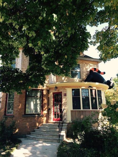 Кот имел бешеный успех у местного населения. Если мы были на улице, то прохожие непременно останавливались и комментировали, как удачно смотрится, какое "хэллоуинское" настроение создаёт и т.п. Первые дня три была просто благодать. Тут дочка приехала, на один день (привезла нам двух котят). Ей надувной кот тоже поглянулся, она даже сфотографировала.