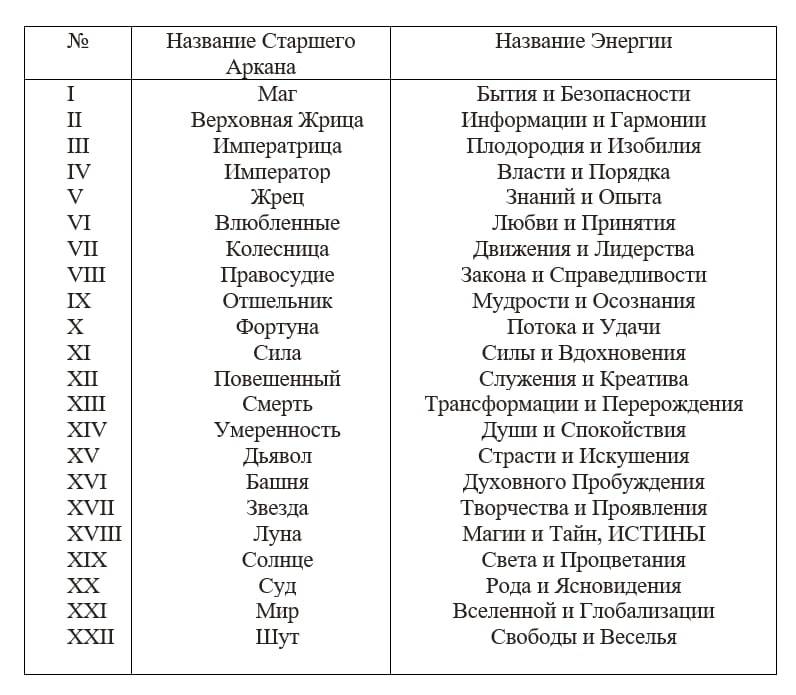 Ниже я укажу обозначения и названия Старших Арканов в том порядке, как они были записаны изначально и названия Энергий, которые им соответствуют в методе «Цветок Души»: