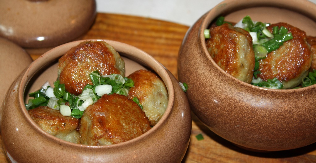 Мясо нарезать кусочками (хорошо, если оно подморожено). Мясо вместе с репчатым луком и чесноком пропустить через мясорубку. Фарш посолить, приправить пряностями и зеленью укропа, перемешать. Разделать фарш на маленькие шарики.