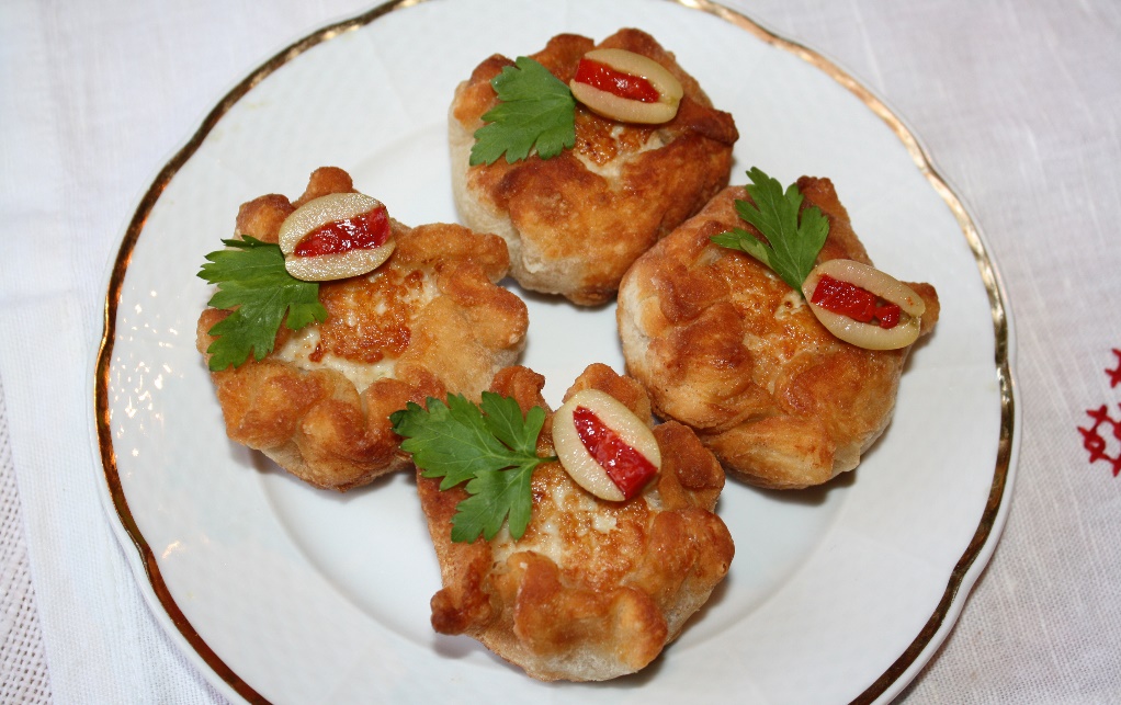 Беляши выложить на кухонное полотенце, затем на тарелку. Гарнировать оливками, оформить пряной зеленью.