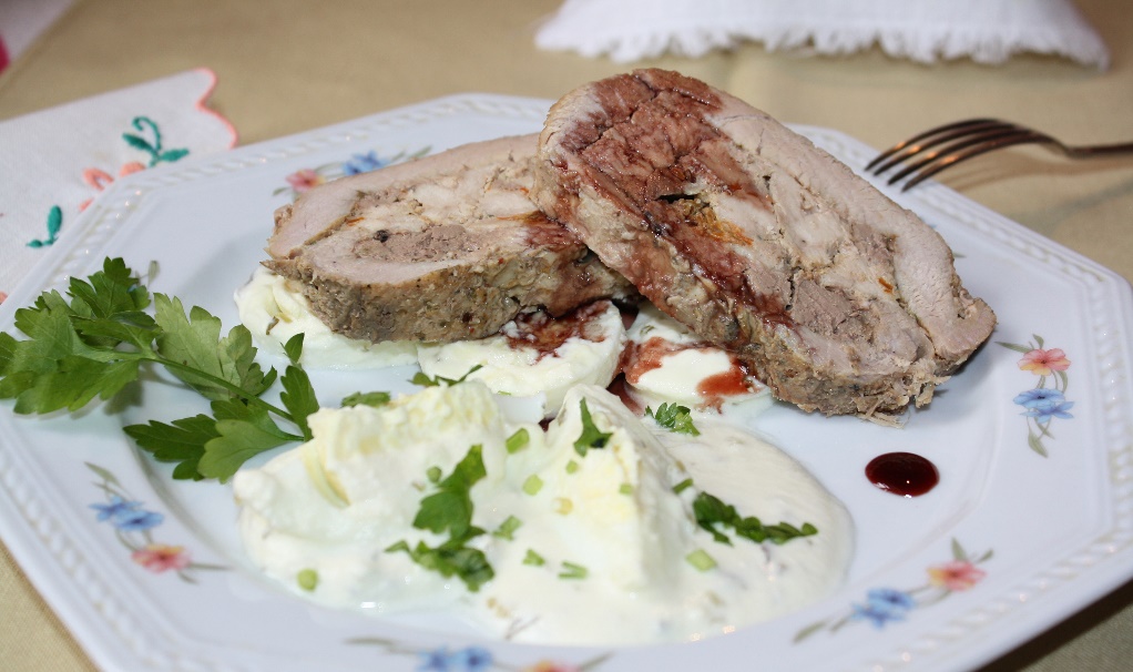 400-500 гр готового запеченного рулета из свинины и курицы, 4-5 яиц, около 300 мл густой сметаны, 2 зубчика чеснока, 2 столовые ложки рубленой зелени петрушки, 100 мл красного вина, неполная столовая ложка сахара, щепотка ванилина (или несколько зерен натуральной ванили).