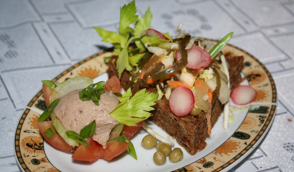 300 гр телячьей печенки, 150 мл молока, 4 столовые ложки растительного масла, 100 гр отварных грибов, 50 гр репчатого лука, по 1 столовой ложке майонеза, сметаны и уксуса из яблочного сока 4,5%, по 1 чайной ложке растительного масла, настоянного на чесноке и сахара, 1 зубчик чеснока, 1 кофейная чашка 125мл риса, 150 мл воды, 0,3 чайной ложки соли (для заправки риса), 50 гр маринованного перца, 2 отварные яйца, соль, перец по вкусу.