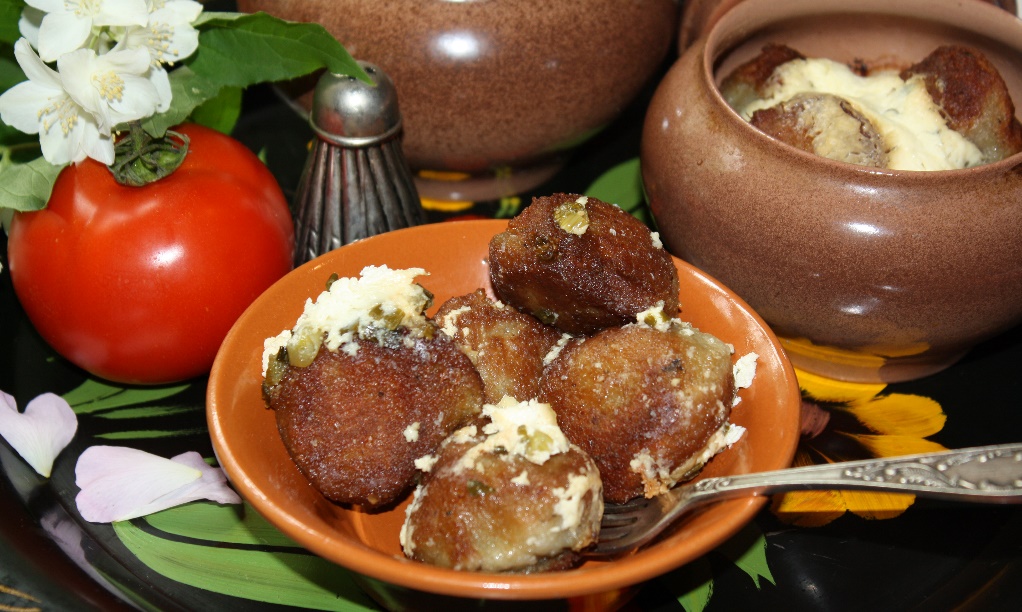 Подавать бульбяники на стол можно в горшочках. Отдельно подать свежие овощи и сметану.