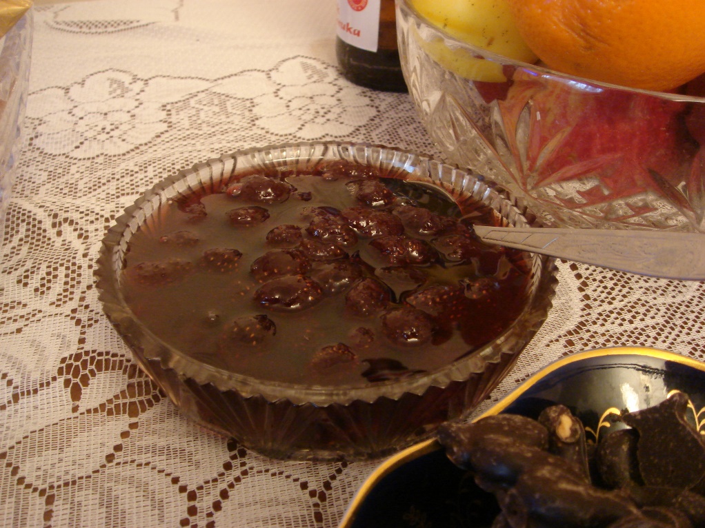 Варить варенье в четыре – пять приемов по 3-4 минуты каждый раз с интервалами в 4-5 часов. Перед последней варкой добавить ванилин и коньяк.