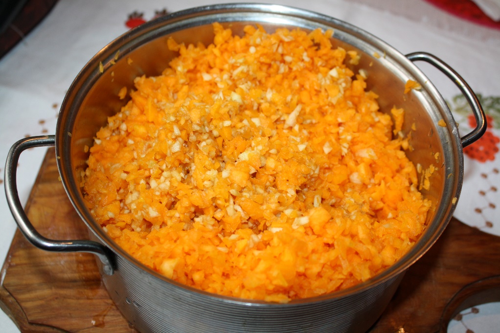 По 500 гр мякоти сладкой тыквы и очищенных яблок, 2 крупные груши весом до 400 гр, 1 необработанный лимон, 2 столовые ложки очищенных от кожицы, крупнодробленых грецких орехов, 0,75 стакана воды, 1 кг сахара, 0,25 чайной ложки ванилина, 2 столовые ложки коньяка.