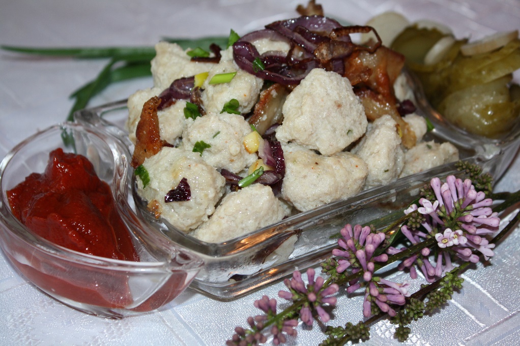 400 гр картофеля, 200 гр филе шейной части свинины, 50 гр лука, 2 зубчика чеснока, 1 яйцо, 1 чайная ложка картофельного крахмала, 1 чайная ложка 9% спиртового уксуса, соль, перец по вкусу. Для шкварок: 200 гр подчеровка (боковая часть брюшного сала), 100 гр лука шалот или красного, 1 чайная ложка растительного масла, соль, перец по вкусу.