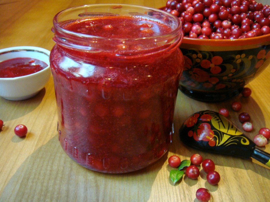 1 кг ягод брусники, 1,3 кг сахара, 400 мл воды, 1 столовая ложка меда, 3 бутона гвоздики, кусочек коры коричного дерева.