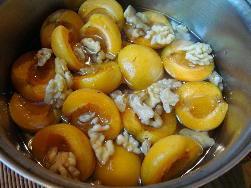 1 кг абрикосов, 1,2 кг сахара, 100 гр очищенных от кожицы ядер грецких орехов или миндаля, сок 1 лимона, 1 стакан воды.