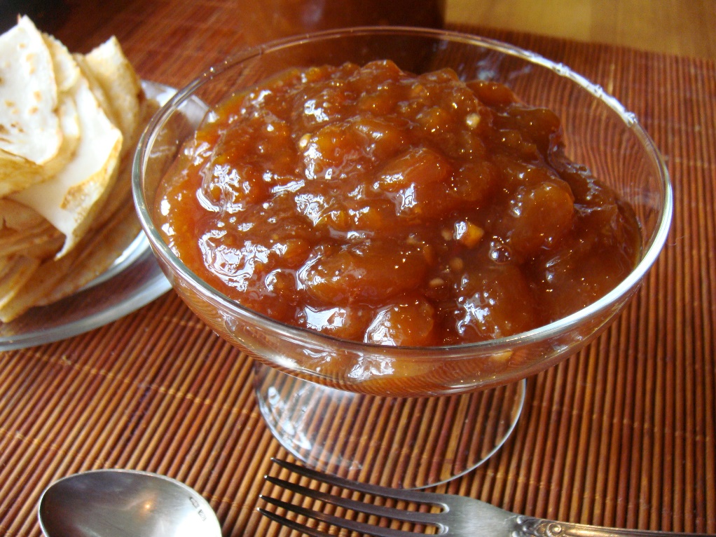 Пюре смешать с сахаром, нагревать, помешивая, до полного растворения сахара. Горячее пюре разложить в банки емкостью 0,5 литра, стерилизовать 20 минут, укупорить.