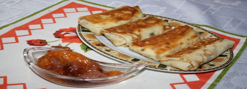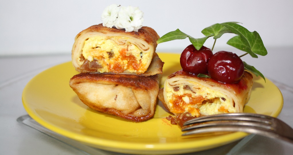 10 готовых бисквитных блинчиков, 200 гр сыра «Сулугуни», 70 гр кураги, 1 столовая ложка густой сметаны, 1 яйцо, около 30-40 мл рафинированного растительного масла.